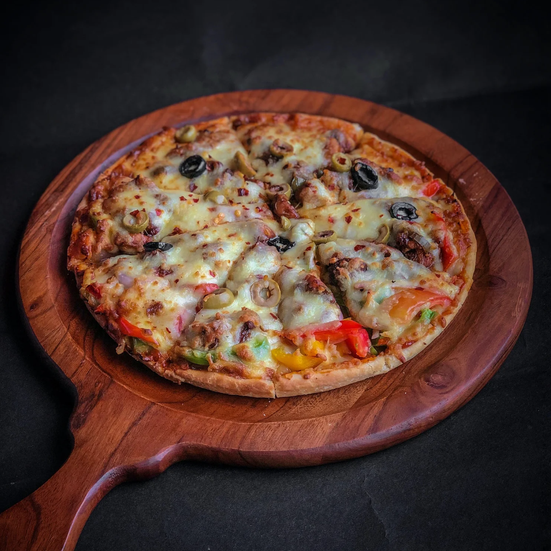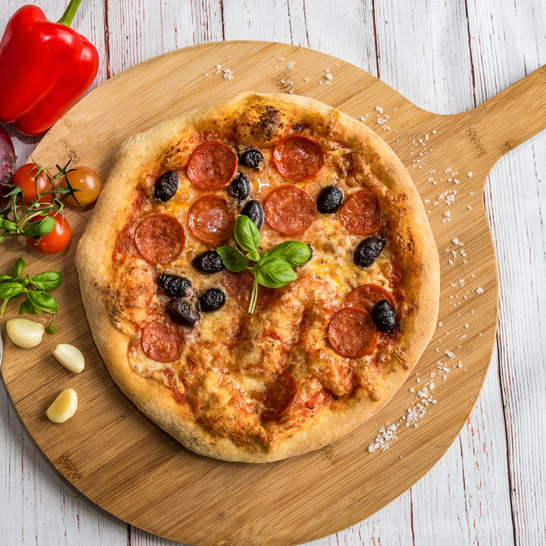 Sauce tomate, pepperoni, poivrons, gruyère et basilic